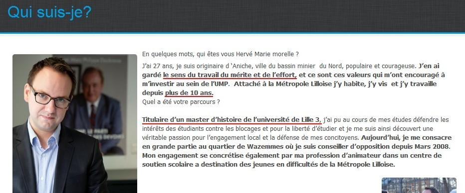 Tout ça, nous le savions donc. Mais nous ne résisterons pas ici à l’envie d’en rajouter une couche. En vérifiant sur son site internet, nous apprenons avec stupéfaction qu’il est « Titulaire d’un master d’histoire de l’université de Lille 3 ». Entouré d’un magnifique blabla tout droit sorti d’un Curriculum Vitae bidon : « j’ai pu au cours de mes études défendre les intérêts des étudiants contre les blocages et pour la liberté d’étudier et je me suis ainsi découvert une véritable passion pour l’engagement local et la défense de mes concitoyens. »