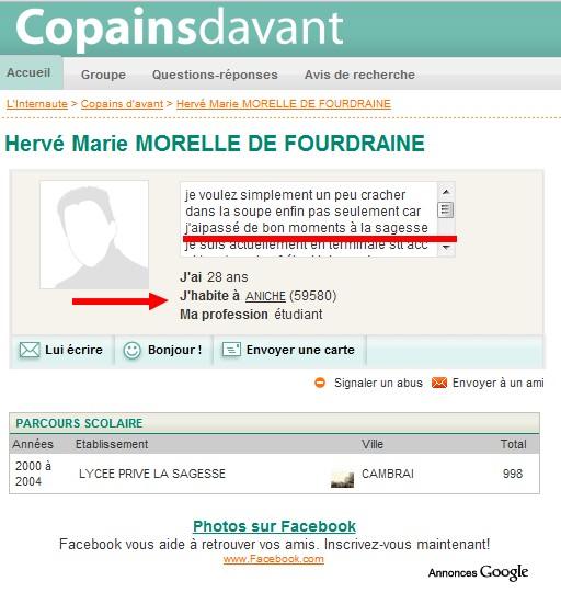 D’ailleurs nous ne sommes plus à un mensonge près. HMM prétend vivre à Lille depuis plus de dix ans. Bizarrement à cette époque il semblait pourtant être interne au Lycée privé La sagesse à Cambrai et vivre à Aniche* (d’ailleurs retournes-y, dans t’*). Comme il est écrit sur Copainsdavant : « je suis actuellement en terminale STT - ACC et je m’envai ouf ; étant interne dans ce lycée depuis 4 ans je suis vraiment heureux de partir ».