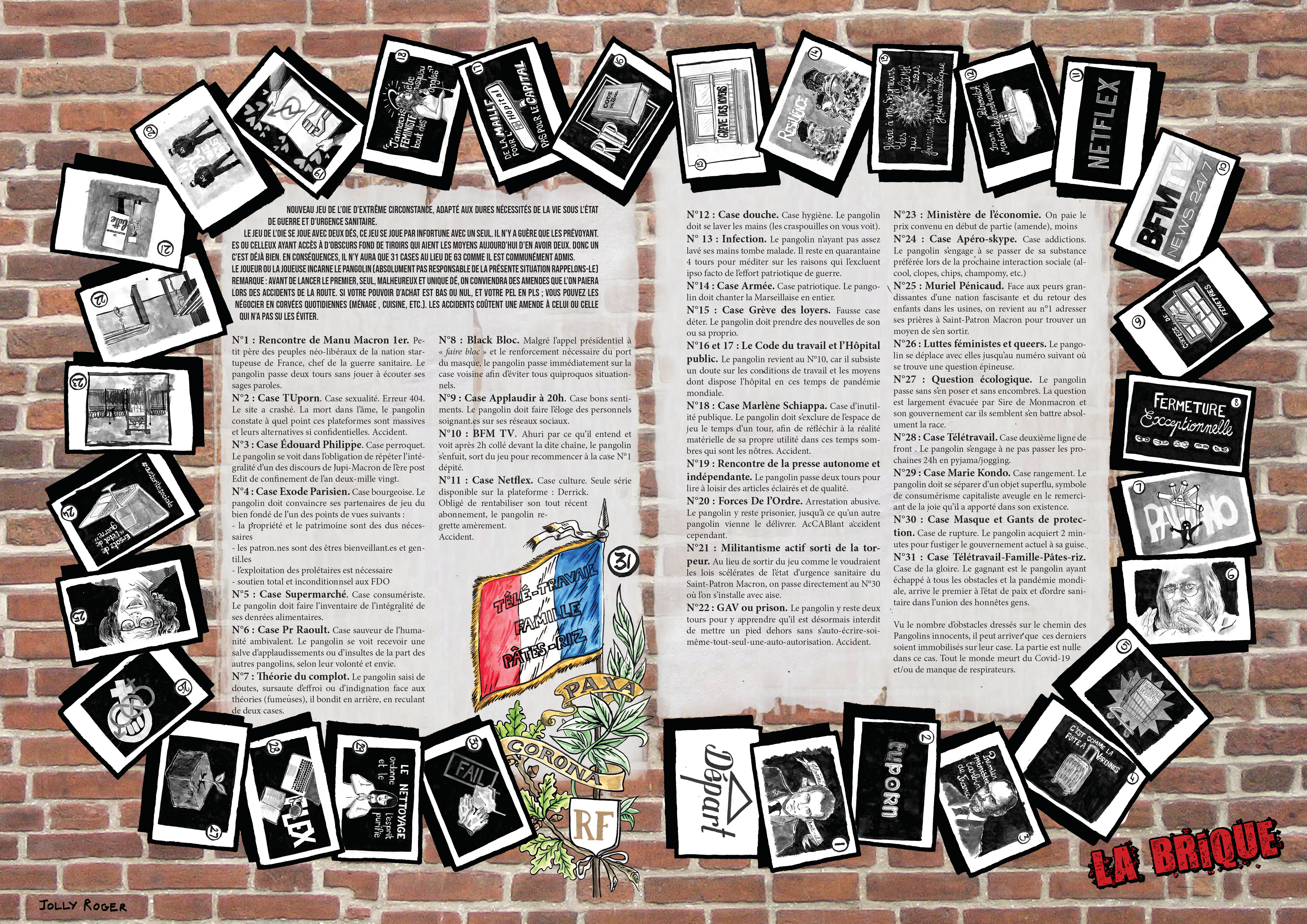 Nouveau jeu de l'oie d'extrême circonstance, adapté aux dures nécessités de la vie sous l'état de guerre et d'urgence sanitaire. Le jeu de l'oie se joue avec deux dés, ce jeu se joue par infortune avec un seul. Il n'y a guère que les prévoyant.es et celleux ayant accès à d'obscurs fonds de tiroirs qui aient les moyens aujourd'hui d'en avoir deux, donc un c'est déjà bien. En conséquence, il n'y aura que 31 cases au lieu de 63 comme il est communément admis.