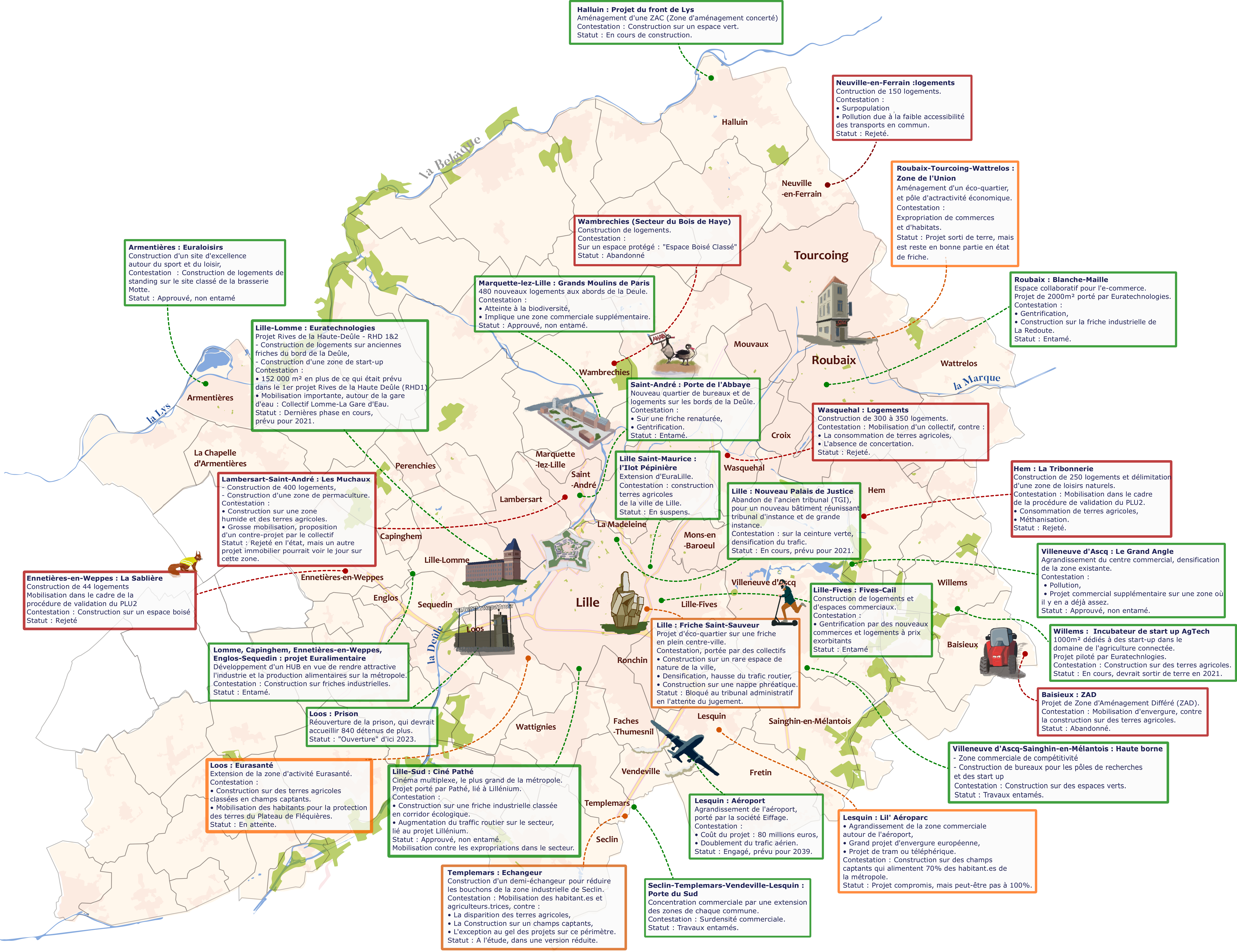 Notice La carte présente une sélection de chantiers envisagés par la MEL, ou en cours de réalisation. Ils sont en majeure partie issus du second Plan Local d’Urbanisme (PLU2). C’est dans le cadre de cette procédure que se cristallisent certaines contestations locales. Lors du vote des projets en décembre 2019, des projets ont été amendés, voire rejetés, sur la base de ces oppositions exprimées. D’autres mobilisations ont été menées en dehors du cadre imposé, par des associations et collectifs déterminés. La carte n’est pas exhaustive, elle ne prent notamment pas en compte les chantiers de rénovation issus de l’ANRU (Agence Nationale de la Rénovation Urbaine), auxquel il faudrait consacrer une carte entière. A noter également que les territoires situés au Sud-Sud-Ouest de la Métropole ne sont pas mentionnés. Ayant été intégrés à la MEL en janvier 2020, ils rejoignent le PLU avec retard et leurs projets n’ont pas encore été formalisés. |