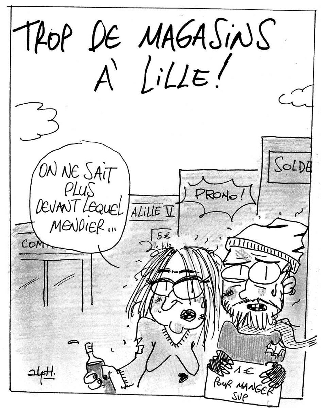 Et reconstruire c’est quoi pour une socialiste ? L’implantation célébrée en grande pompe de Microsoft, avant-garde mondiale de la gestion ouvrière d’Etat ; la démolition de barres HLM pour installer Euralille 2, centre de coopératives autogestionnaires ; ou encore un commissariat populaire à l’entrée de Lille Sud. En face, il est prévu l’implantation prochaine d’un supermarché Carrefour. Pourtant, dans un rayon de dix minutes en voiture autour de Lille Sud, on compte déjà cinq supérettes, trois supermarchés et trois hard discount. Boulevard des modes, les pauvres devront désormais passer entre l’aliénation douce de « Carrefour, je positive », à droite, et la méthode plus brutale du comico, à gauche. Pousseurs zé pousseuses de caddie de tous les pays, croyez-nous, l’utopie est en marche.