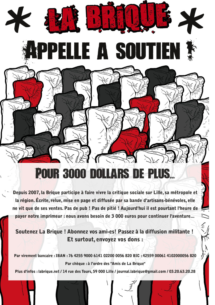 Depuis le printemps 2007 La Brique est tout simplement le seul journal indépendant, « sans pub et sans pitié », face au monopole-régional-de-production-quotidienne-de-papier-à-caractère-décérébrant qu’est La Voix du Nord. Ce travail, nous le faisons bénévolement, à jongler entre RSA, études, esclavage salarial, et le reste de ce que comprend une vie : les amours, les ami-es, parfois la famille. Tout ça sans standardiste ni rédac’ chef. Toutes les heures sont supplémentaires, et ne rapportent aucun point retraite. Et puis, un peu d’humilité n’a jamais tué personne : La Brique est le seul journal qui puisse dire que La Voix du Nord et Nord Éclair ne sont que des torchons publicitaires, et le démontrer. La seule qui enquête sur des pollutions au plomb en plein quartier populaire à Lille Sud. La seule qui écrive sur des bavures policières ; le racisme ordinaire ; les expulsions des pauvres de leur quartier ; l’écologie citoyenne à la mords-moi-le-noeud ; la lesbophobie institutionnelle ; l’absurdité des politiques migratoires ; l’histoire ouvrière et la culture populaire face à la machine de guerre Lille 3000 ; d’autres manières de concevoir l’habitat, l’éducation… C’est aussi la seule qui se revendique comme subjective et partisane : le sens qu’elle met à son travail participe ouvertement à une lutte politique. Si vous n’avez pas entendu les violons sur cette dernière envolée et que vous n’avez pas la larme à l’œil, c’est qu’on ne peut plus rien faire pour vous. La Brique c’est pas cher, et on accepte les chèques, les virements bancaires, la petite monnaie et toute votre ferraille.