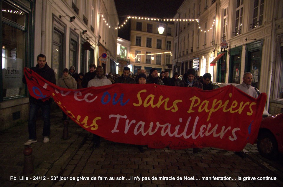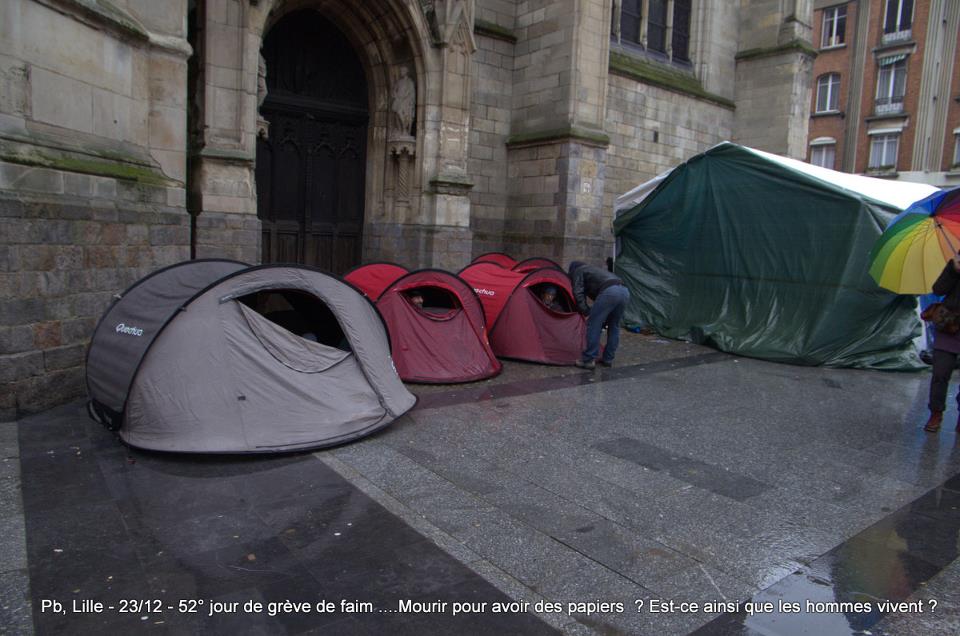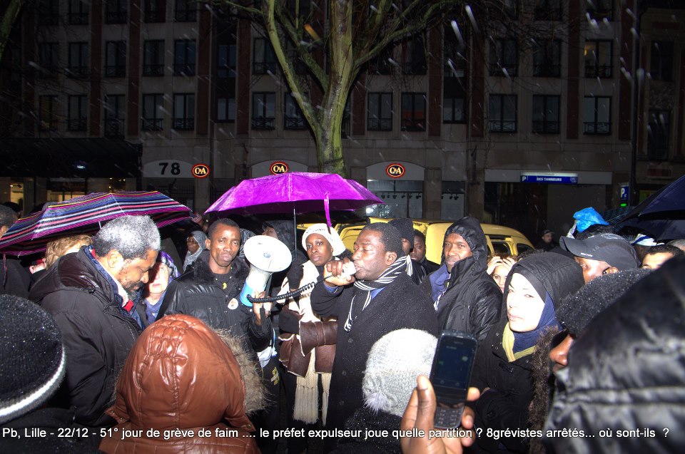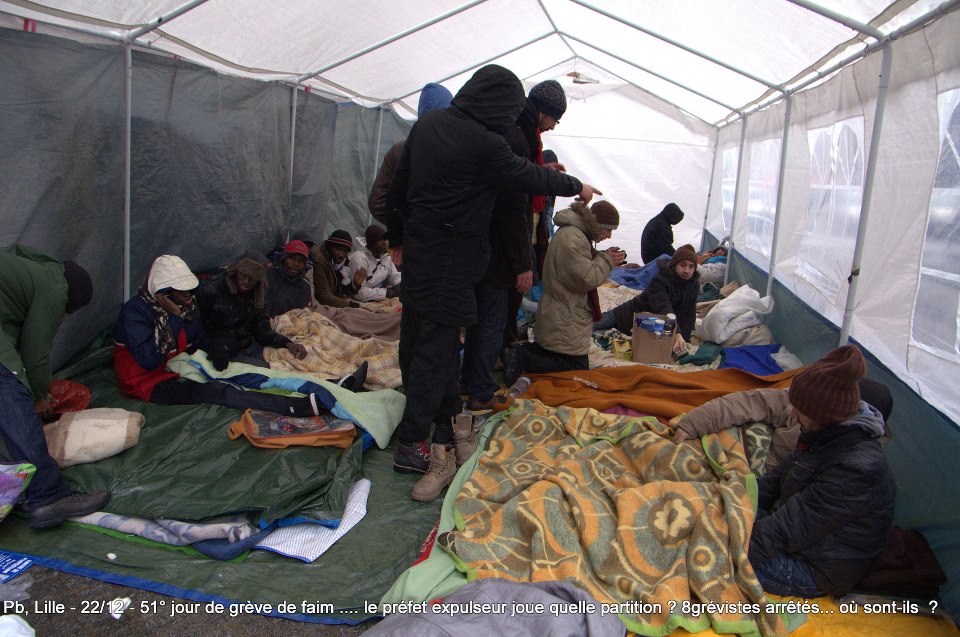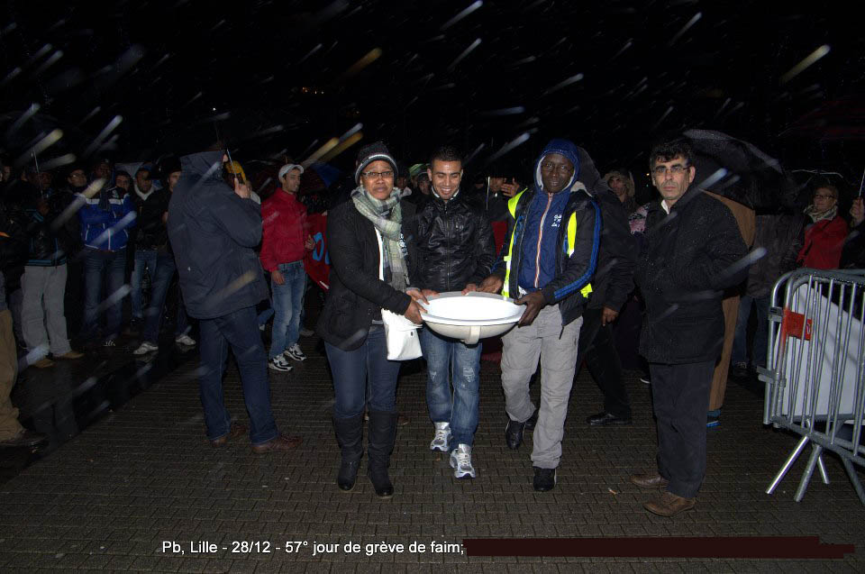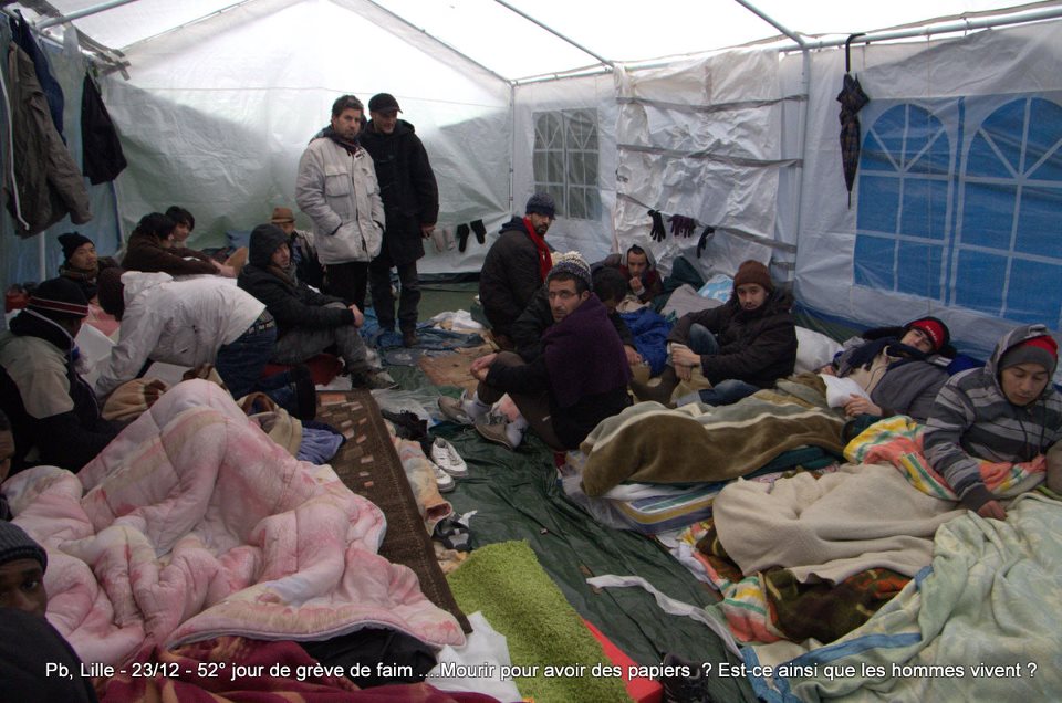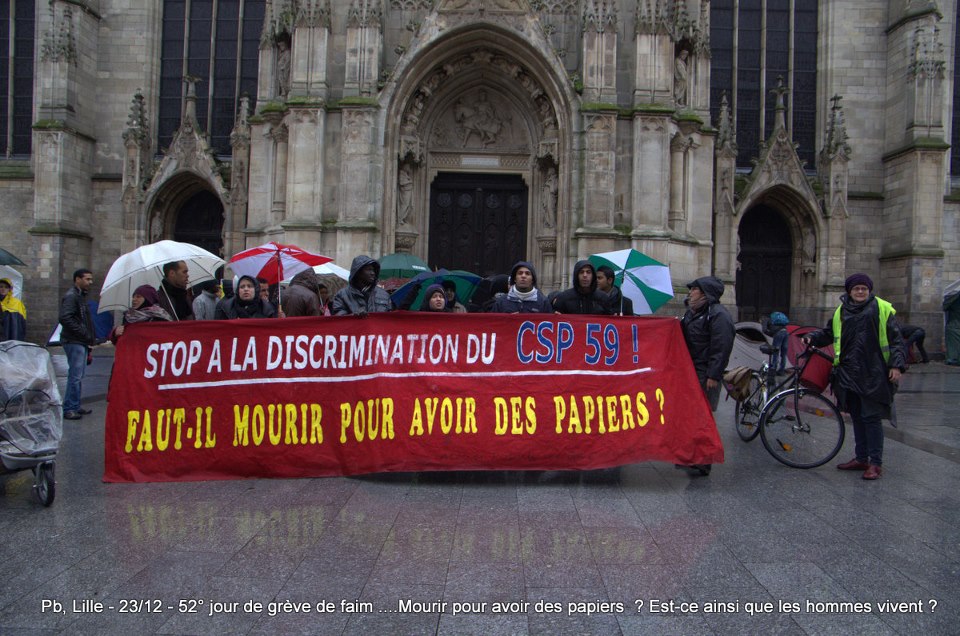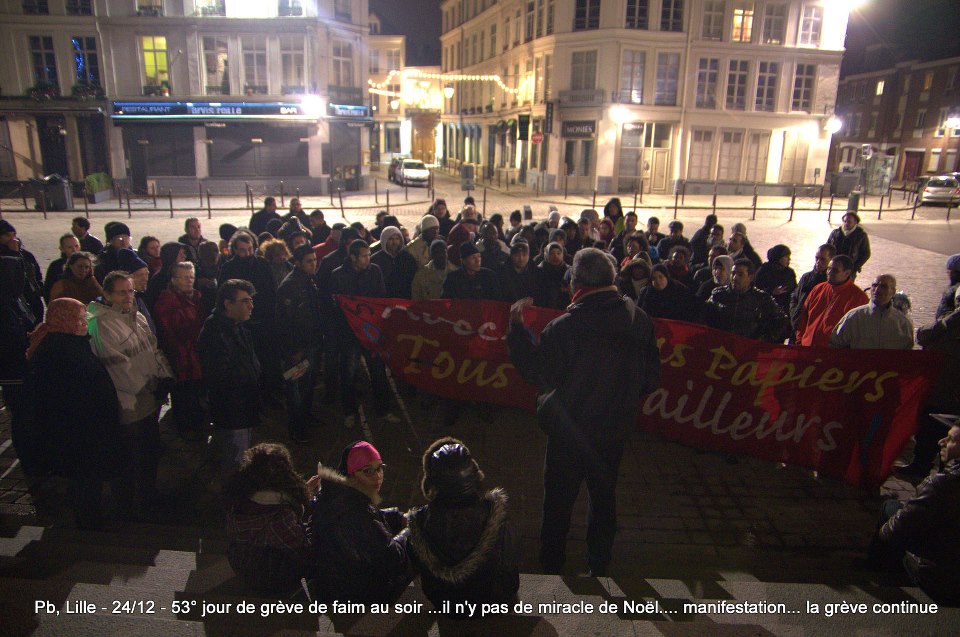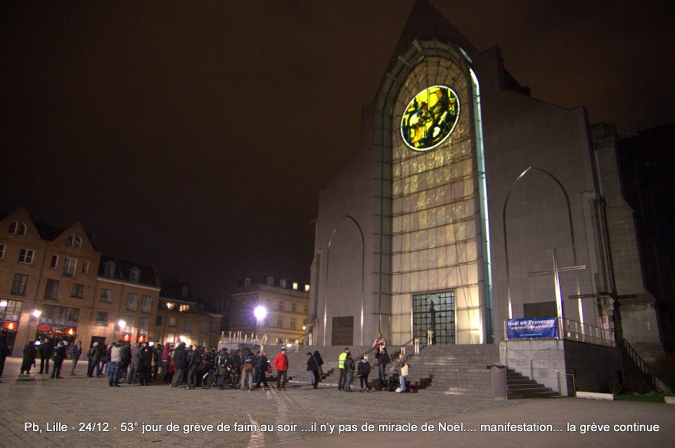 Ils sont désormais soixante-six à poursuivre la grève de la faim sur le parvis de l’Eglise Saint-Maurice. Soixante-six grévistes, sortis des hôpitaux de la région et réunis pour poursuivre collectivement le bras de fer avec la préfecture. Le 22 décembre dernier, ils ont reçu le soutien de plus de deux cents sans-papiers issus de collectifs parisiens et venus à Lille pour manifester leur solidarité envers leurs frères et sœurs de lutte [5]. Hier, jeudi 27 décembre, ces mêmes collectifs appelaient à une manifestation de soutien avec les grévistes du CSP59 devant le ministère de l’Intérieur, afin de « demander le règlement en urgence de la situation des grévistes de la faim de Lille » [6]. Trêve des confiseurs ou pas, les sans-papiers entendent bien poursuivre la lutte en cours. D’ici, du moins, à ce que la France anti-raciste se réveille et que Manuel Valls s’étouffe avec sa dinde aux marrons.