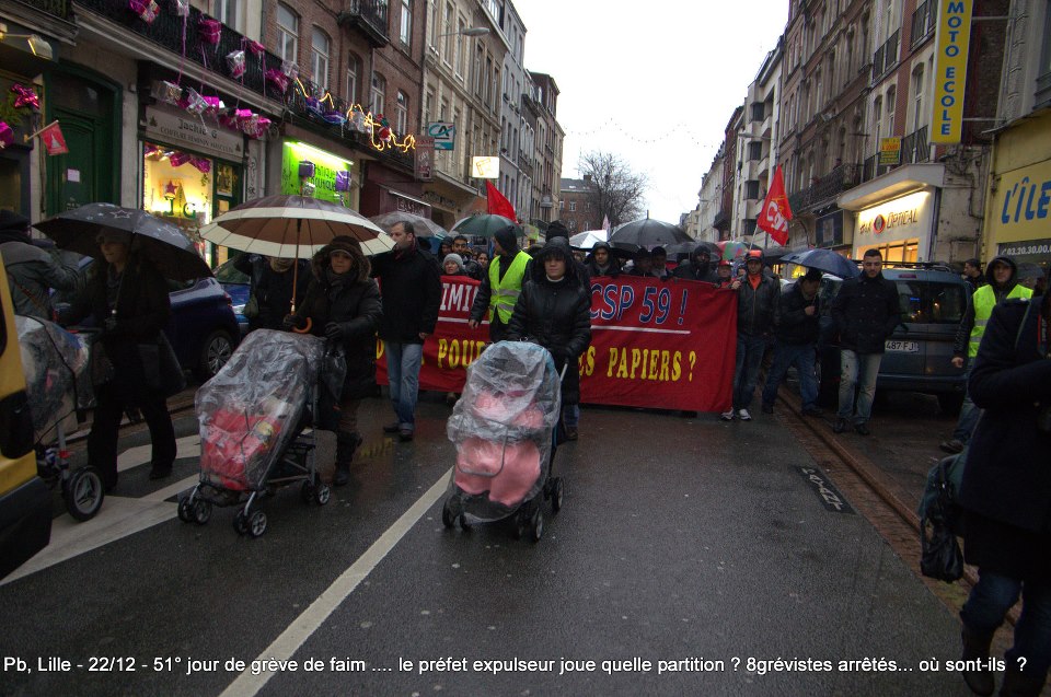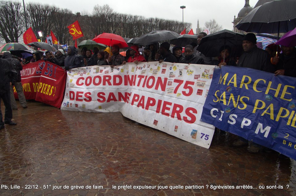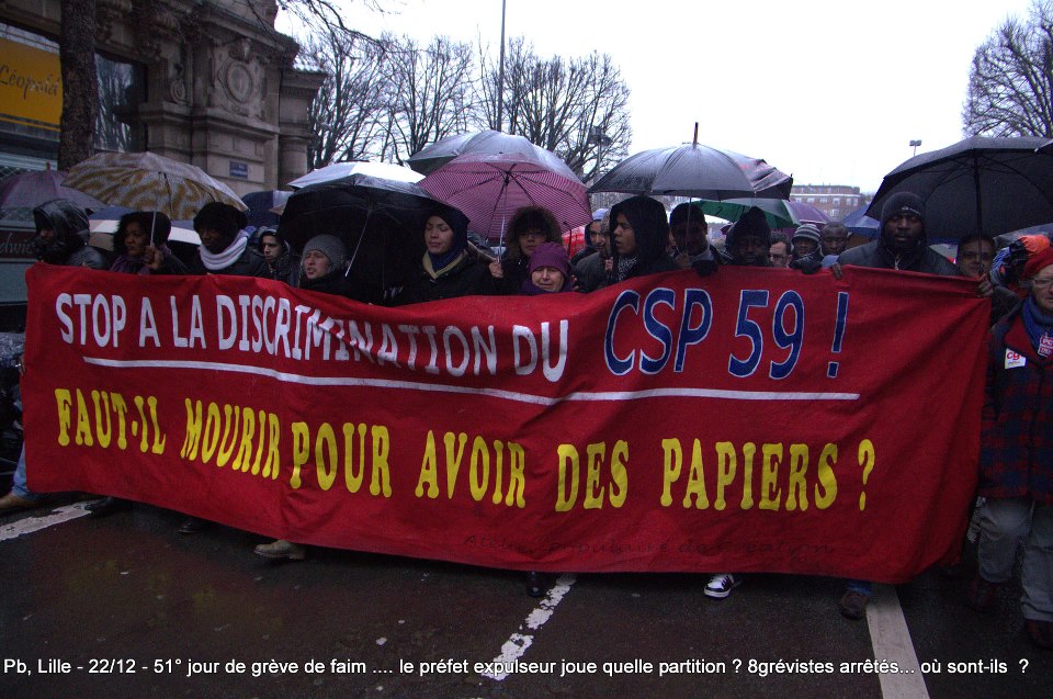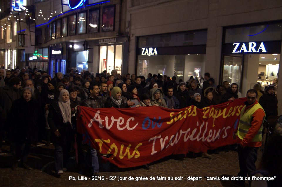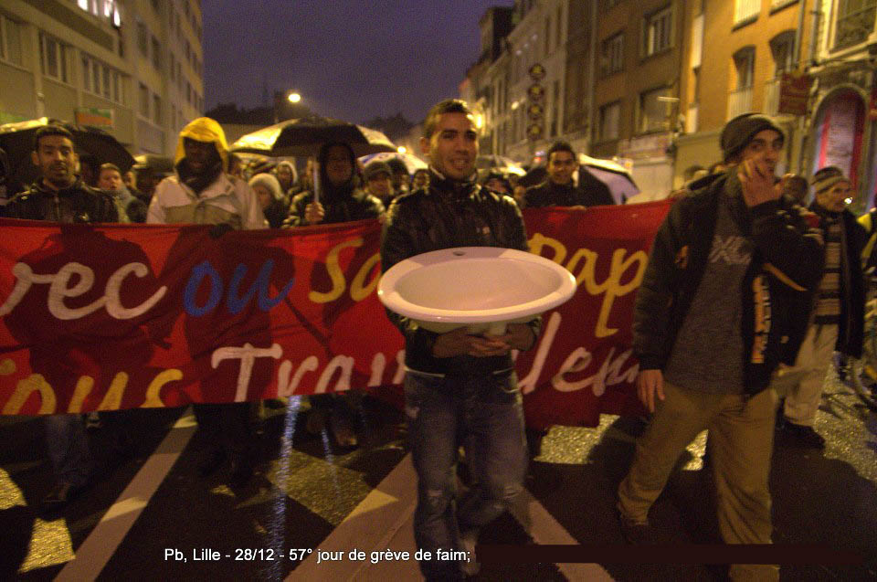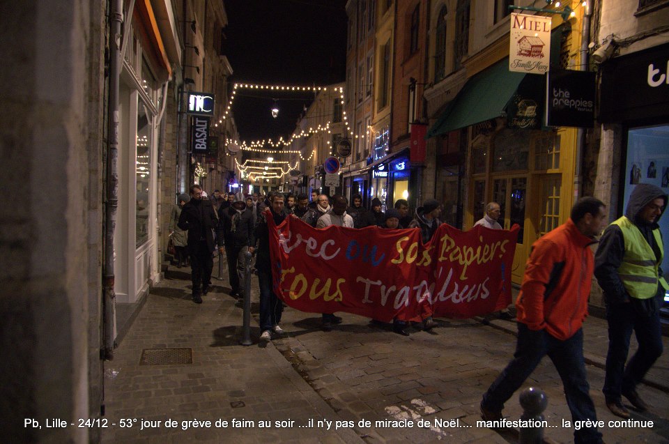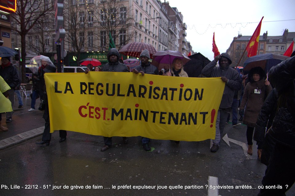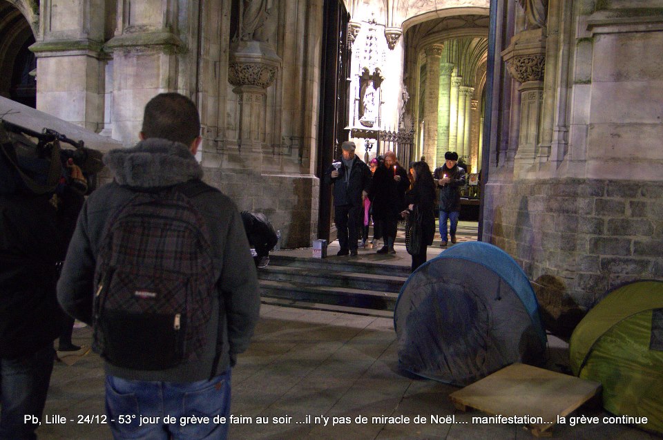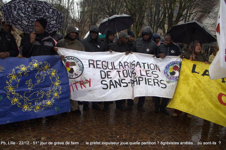 Ils sont désormais soixante-six à poursuivre la grève de la faim sur le parvis de l’Eglise Saint-Maurice. Soixante-six grévistes, sortis des hôpitaux de la région et réunis pour poursuivre collectivement le bras de fer avec la préfecture. Le 22 décembre dernier, ils ont reçu le soutien de plus de deux cents sans-papiers issus de collectifs parisiens et venus à Lille pour manifester leur solidarité envers leurs frères et sœurs de lutte [5]. Hier, jeudi 27 décembre, ces mêmes collectifs appelaient à une manifestation de soutien avec les grévistes du CSP59 devant le ministère de l’Intérieur, afin de « demander le règlement en urgence de la situation des grévistes de la faim de Lille » [6]. Trêve des confiseurs ou pas, les sans-papiers entendent bien poursuivre la lutte en cours. D’ici, du moins, à ce que la France anti-raciste se réveille et que Manuel Valls s’étouffe avec sa dinde aux marrons.