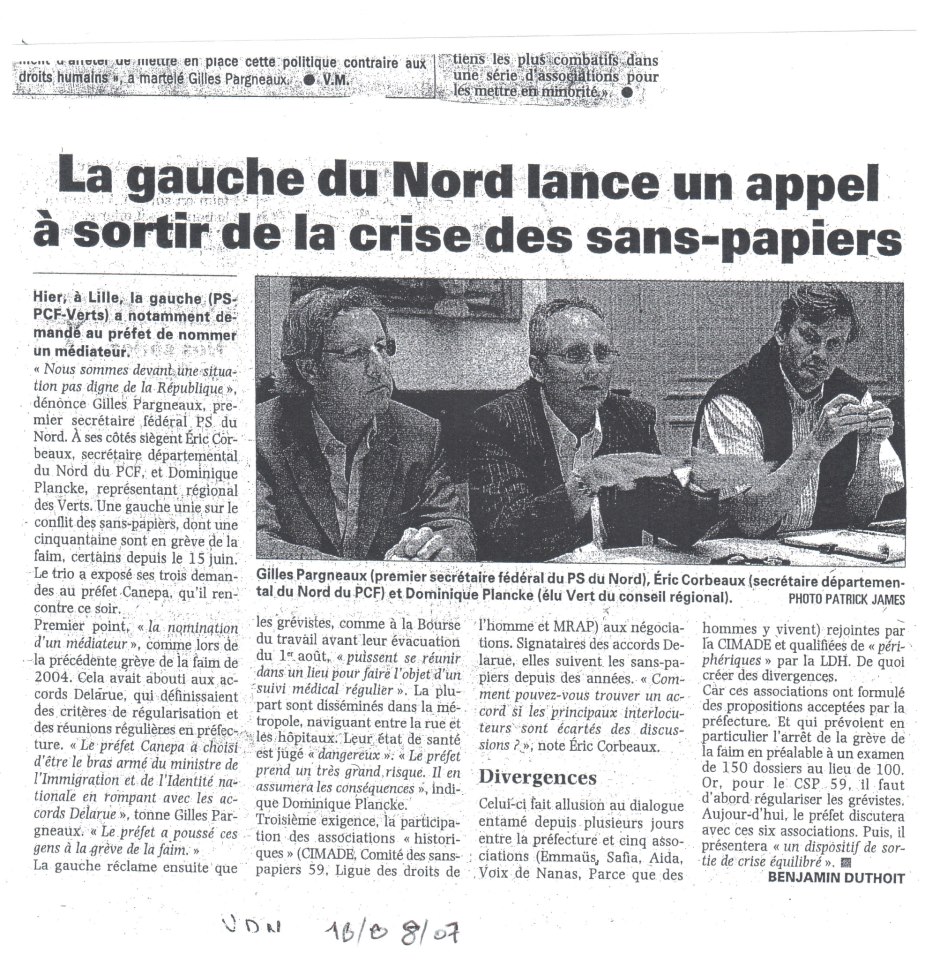 [3] « La gauche du Nord lance un appel à sortir de la crise des sans-papiers », Voix du Nord, 10 août 2007.