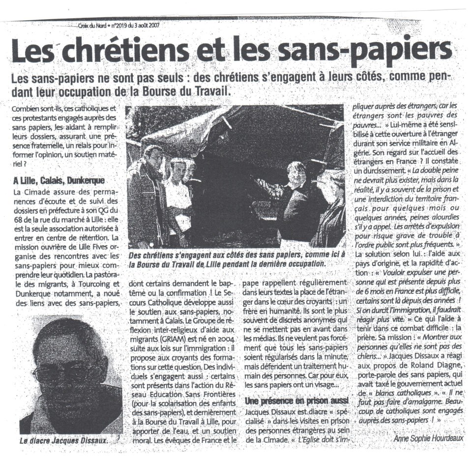 « Les sans-papiers ne sont pas seuls : des chrétiens s’engagent à leurs côtés ». C’est ce qu’on peut lire dans les colonnes de La Croix du Nord du 3 août 2007 dans le sous-titre d’un article intitulé « Les chrétiens et les sans-papiers ». C’était à l’été 2007 et les sans-papiers grévistes de la faim occupaient alors la Bourse du travail de Lille. À l’époque, Monseigneur Defois, archevêque du diocèse de Lille, signait, en compagnie des autorités religieuses des différents cultes, un communiqué commun indiquant à la préfecture son souhait « que l’action de désespoir menée par ces grévistes ne soit pas vaine » [1].