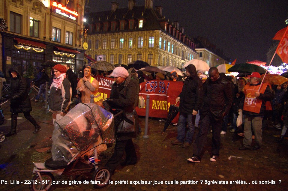 Aujourd’hui, c’est l’infâme Manuel Valls qui tient le rôle du gendarme pour le compte du gouvernement de coalition PS-Verts. Et les soutiens des sans-papiers, à gauche, ont déserté. Rassemblés à même le parvis de l’Église sous des tonnelles de fortune, les sans-papiers grévistes et leurs soutiens essuient depuis leur éviction les pluies diluviennes qui balaient la région. Parallèlement, le balai des ambulances s’intensifie (on a compté cinq hospitalisation dans la seule soirée du 26 décembre). Martine Aubry , quant à elle, recluse dans son silence depuis le début du conflit, n’a toujours pas répondu à leur demande d’installation de toilettes chimiques.