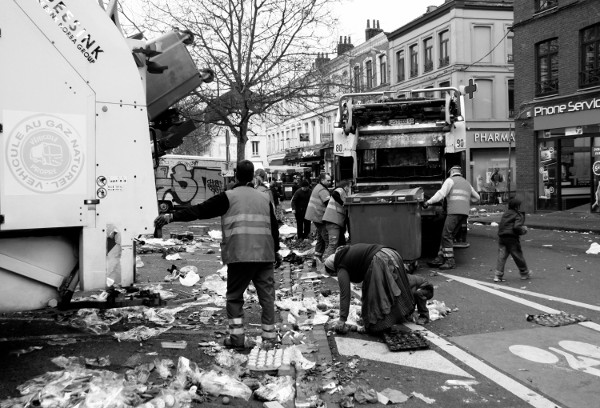 Nettoyer, au sens propre, pour rendre « beau » ce qui est populaire. Et mouvant. Car 650 commerçant-es un dimanche sur un espace aussi restreint, ça génère des tonnes incalculables de déchets. Or, pour y remédier la mairie, tolérante jusqu’alors, a récemment décidé d’appliquer strictement les horaires de fermeture – on ne vend plus à 14 heures, on doit dégager à 15 heures le dimanche, une heure avant le mardi et le jeudi. C’est le problème auquel font face actuellement les commerçant-es. Xavier, du syndicat des marchés, résume : « On ne vide pas un marché comme Wazemmes avec un coup de baguette. Les horaires sont complètement absurdes. Les services de réglementation mettent la pression pour qu’on remballe plus vite ! » Et la mairie envoie maintenant les entreprises de nettoyage – Esterra et Derichebourg – à 13 heures 15, alors même que le marché est en plein bouillonnement. « Le problème que rencontre la Ville, c’est pas les horaires mais la propreté du quartier ». Un matin de janvier, alors que j’étais transformé en glaçon, Xavier m’appele pour m’inviter à boire un café et me présenter des collègues ainsi que Jean-Loup Lemaire, fondateur de La Tente des Glaneurs. L’objectif de cette association est simple : glaner de la nourriture abandonnée par les marchand-es pour la redistribuer à une population qui, selon les termes de M. Lemaire, « traverse une précarité alimentaire ». En deux ans d’existence, 61 tonnes de produits ont été redistribuées à plus de 1843 familles. Tout en faisant « gagner une heure de nettoyage aux équipes de la ville ». C’est donc sa seconde fonction : « Assainir le marché ». Pour la mairie ? L’association n’existe pas « grâce à la mairie, mais grâce à une réflexion d’habitants », née « lors d’une rencontre avec Jacques Mutez qui a soulevé la problématique du glanage sauvage ». Une épine en moins dans le pied d’Aubry qui soigne, mandat après mandat, son bilan politique.